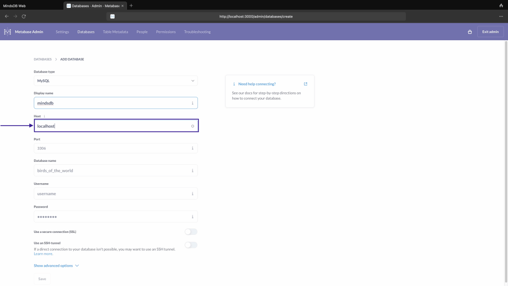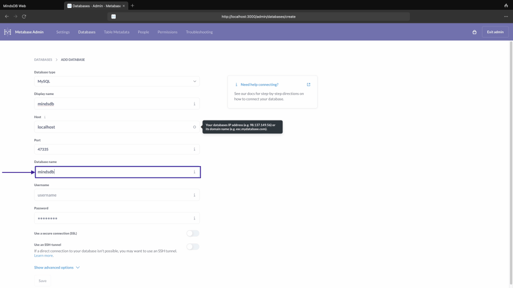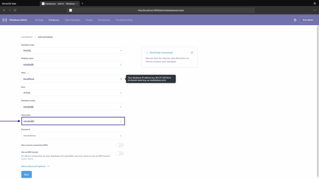 Step 08: In User name type mindsdb, as we have not given any password, we will leave password as blank.