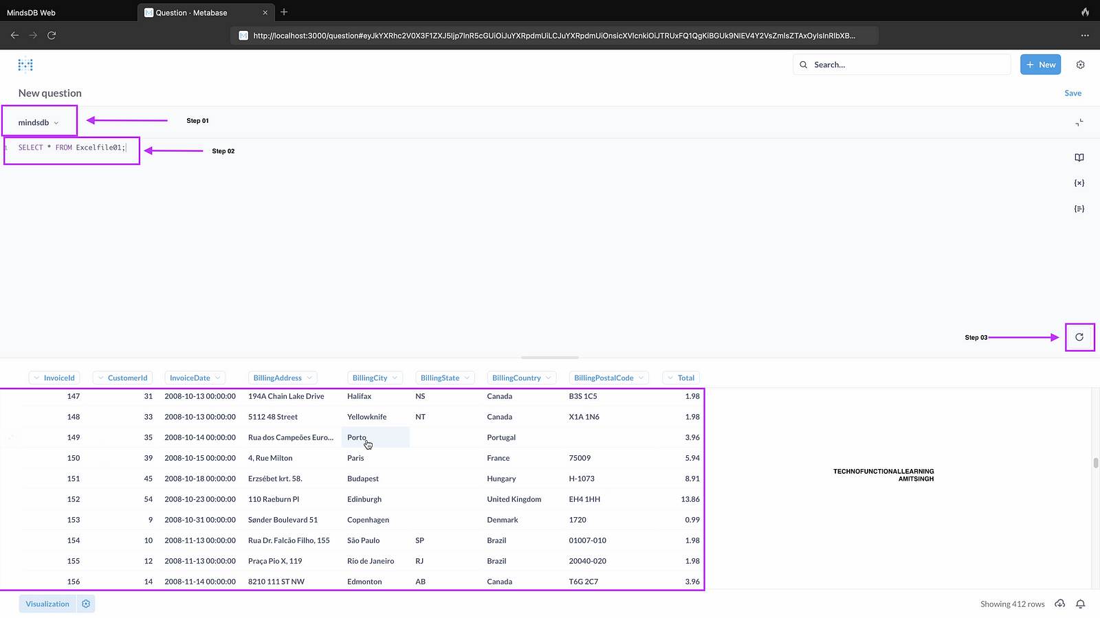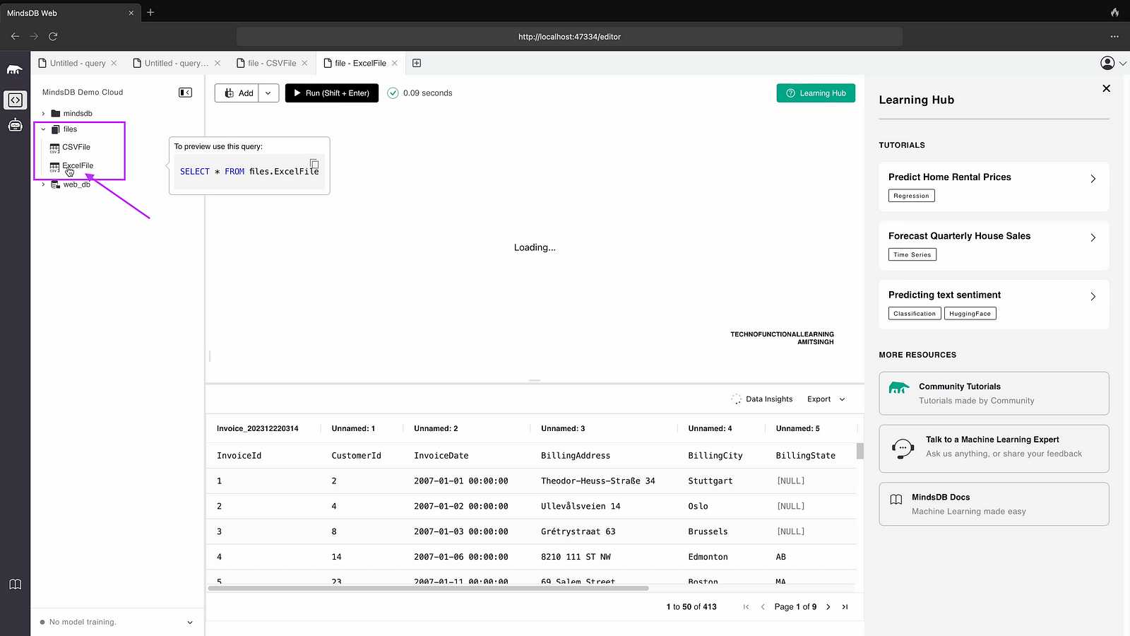 Step 17: Now select your database as mindsdb and write simple SQL select command for Excel File and click on run as shown in below screenshot step by step