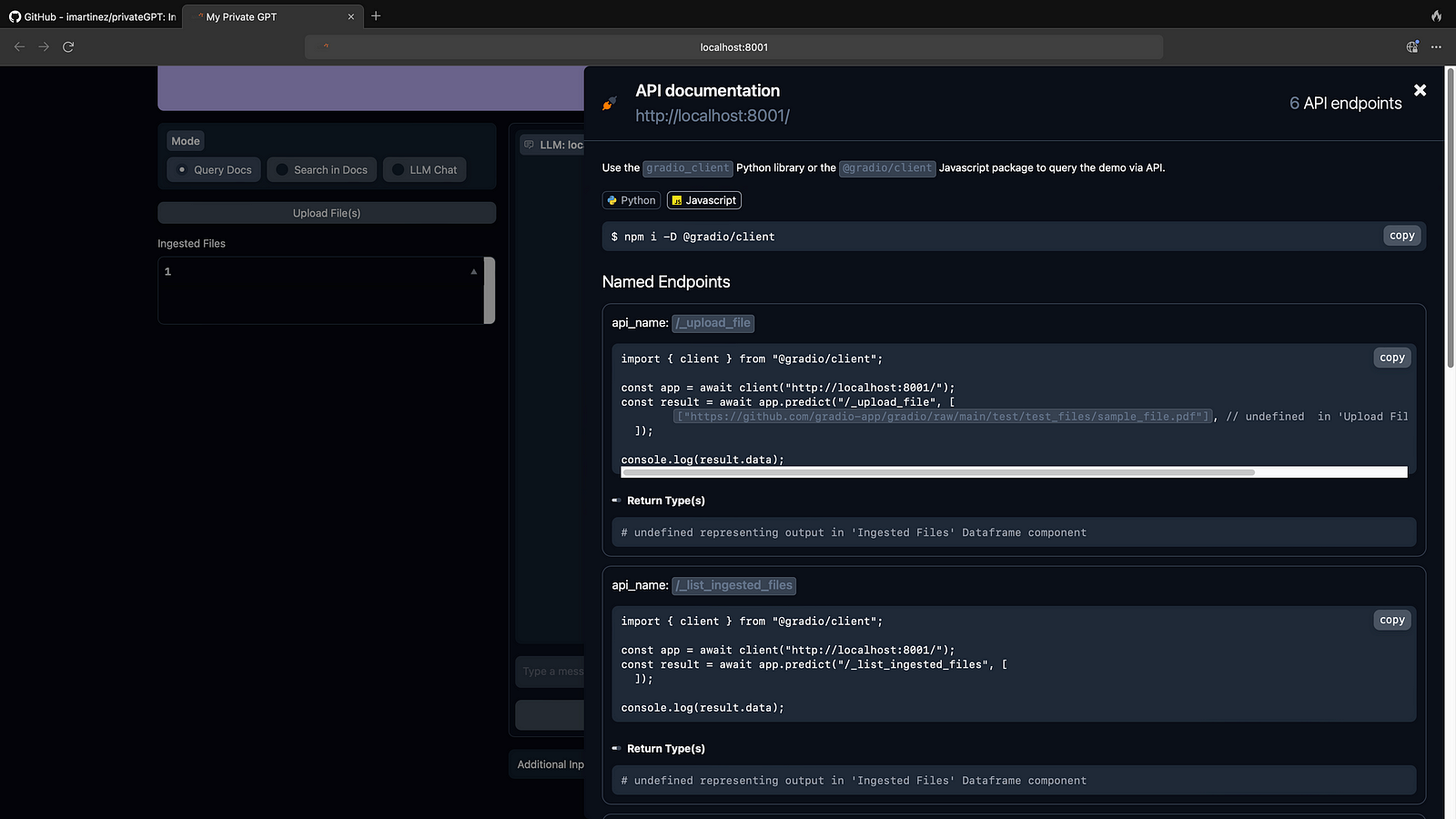 Step 07: Now you can start chatting, or upload documents or search documents, choose appropriate option and run privateGPT, if you need to work with python or javascript API then you can click down below link in UI (user interface) just below addtional inputs section.