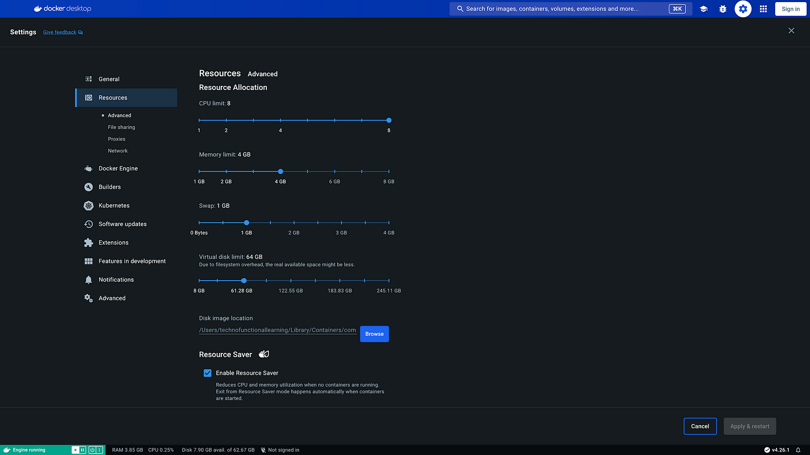 Step 04: In Setting section of docker, choose resources and allocate sufficient memory so that you can interact well with privateGPT chat and upload document so that it can summarize it for you without disconnection.