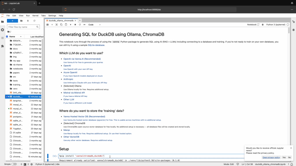 Learn to Connect Duckdb database and Query in Natural Language with Vanna AI+Ollama and get automated Visualization with Plotly, Other Important Tools/Database/LLM in this Article are ChromaDB/Jupyter Notebook/Mistral.