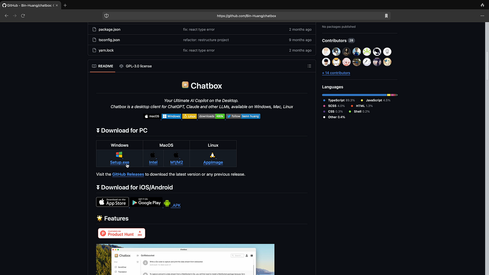 Step 01: Visit Github repo of chatbox as shown on below screenshot and click on Windows Installer.