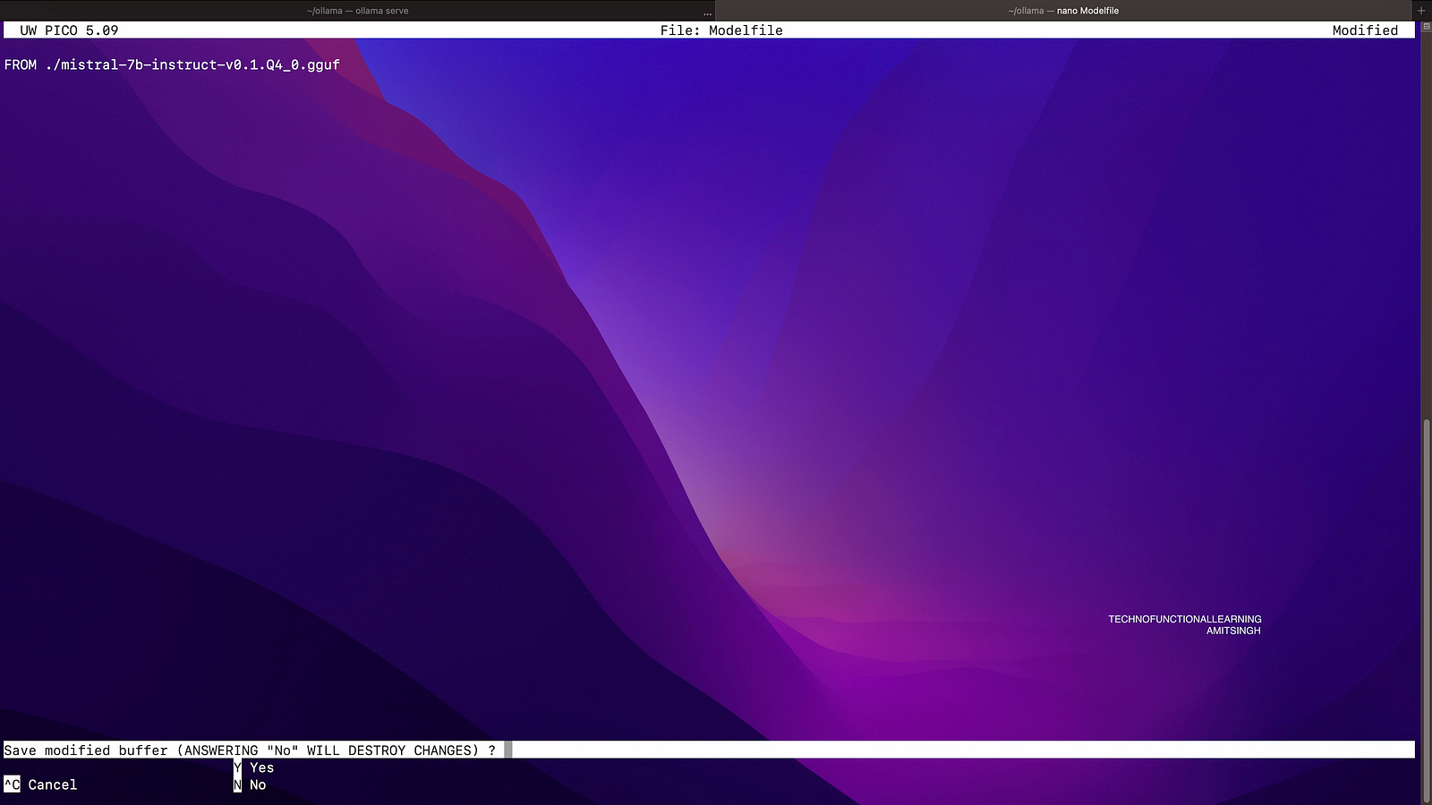 Step 04: Now close file editor with control+x and click y to save model file and issue below command on terminal to transfer GGUF Model into Ollama Model Format.