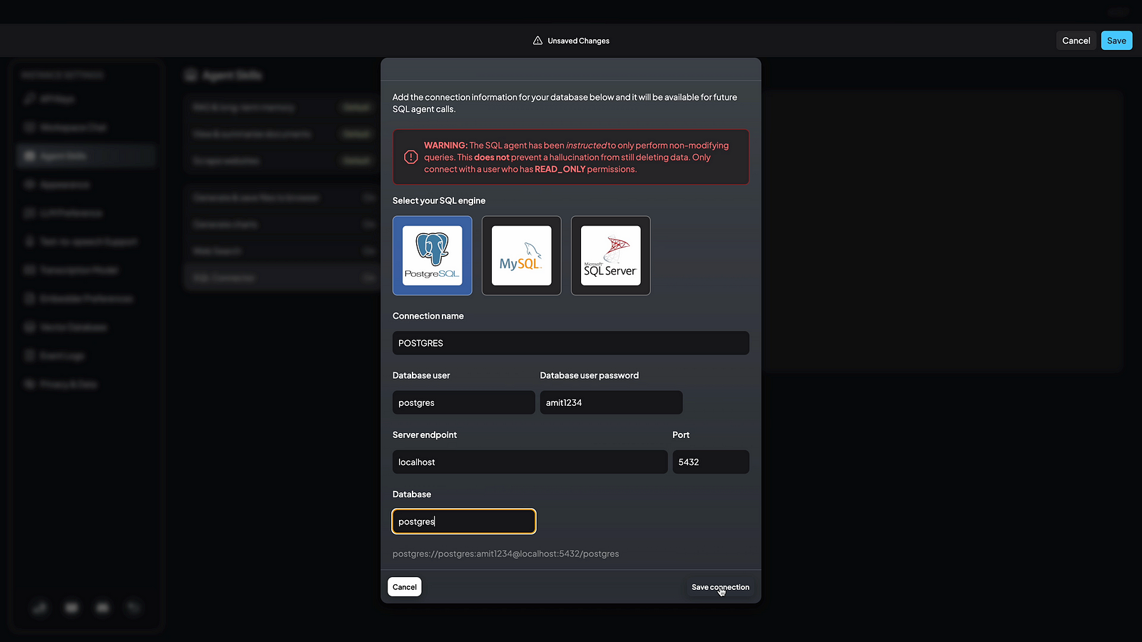 Step 09: Click on PostgreSQL and enter connection details like name, database username, password, host, port & database name then click on save connection