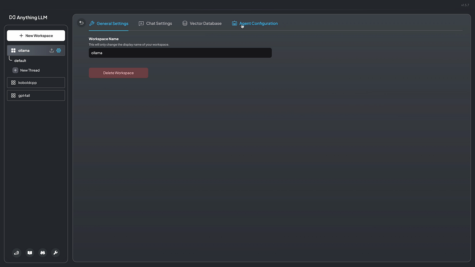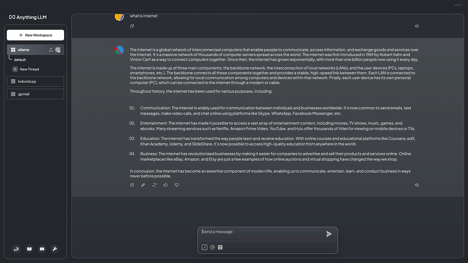 AnythingLLM divides your documents into objects called workspaces. A Workspace functions a lot like a thread, but with the addition of containerization of your documents. Workspaces can share documents, but they do not talk to each other so you can keep your context for each workspace clean.