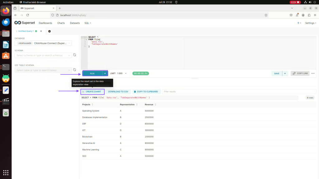 Step 10: Now after running query and getting data, you can click on create chart to visualize the data.