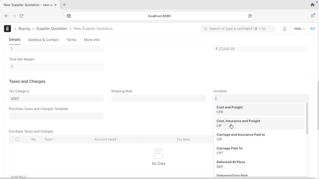 Step 11: Choose your taxes template so that rate can be picked up and calculated automatically.