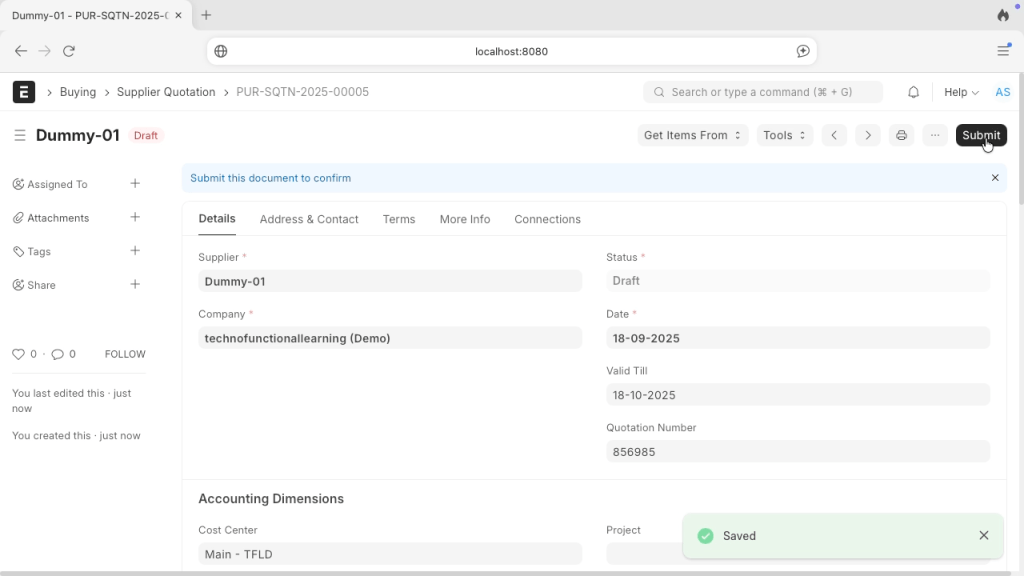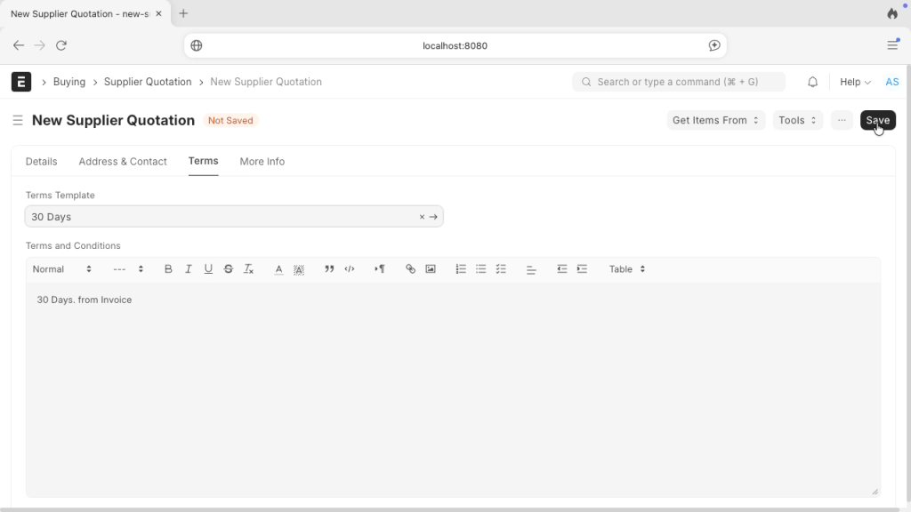 Here is screencast on How to create Supplier Quotation in ERPNext.